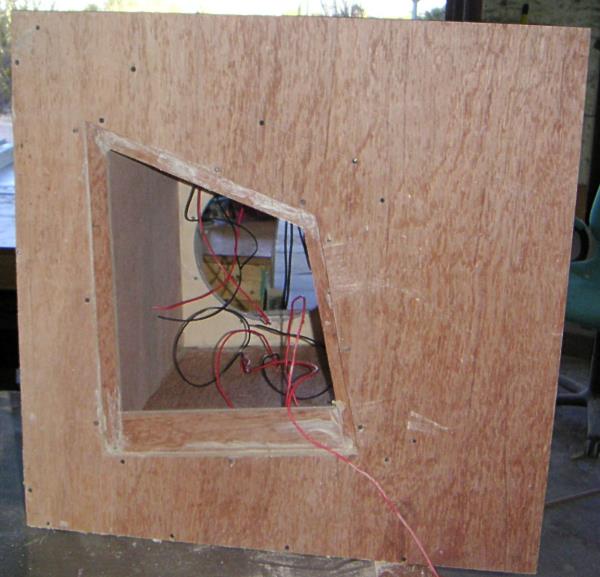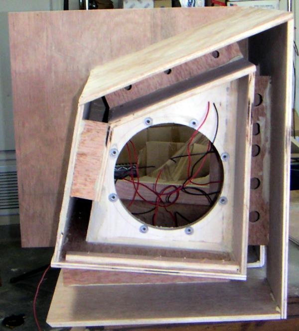 ![]() Here's a thru shot before we mounted the side and bottom. We cut the slot on the back panel for the rear handle first. Then matched the cut on the top. We should have mounted the braces for horn throat before we added the throat panel. We didn't. As a result, I had to make some "compromises". I used a router to flush trim the sides and bottom. |