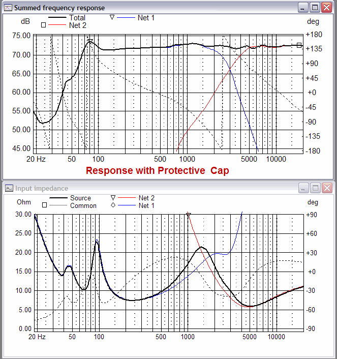 If you want a few more dB and are willing to sacrifice a bit of the bottom end, you can use a protective cap ahead of the woofer circuit. I found 250-300 uF did a nice job of giving the Piccolata a bit more oomph. The cap adds a bit of a knee at about 80-90 Hz so you get the first harmonic boost on those low notes. It won't stop you from blowing the driver with death metal turned up to 11, but it will get you another 2-4 db of overall volume. |